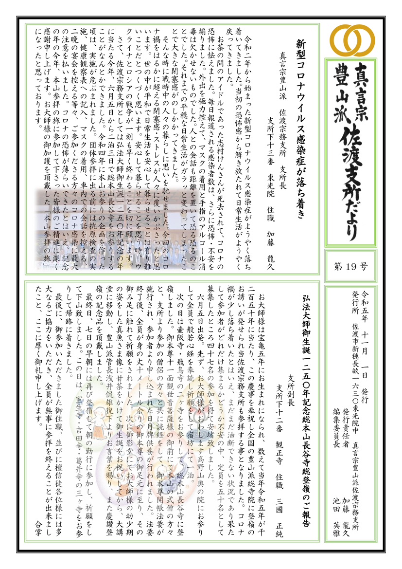 令和5年11月1日発行の佐渡支所だより 第19号をアップロードしました。 画像をクリックしてご覧ください PDFファイルをご覧いただくには「Adobe Reader」が必要です。こちらからダウンロードして下さい。